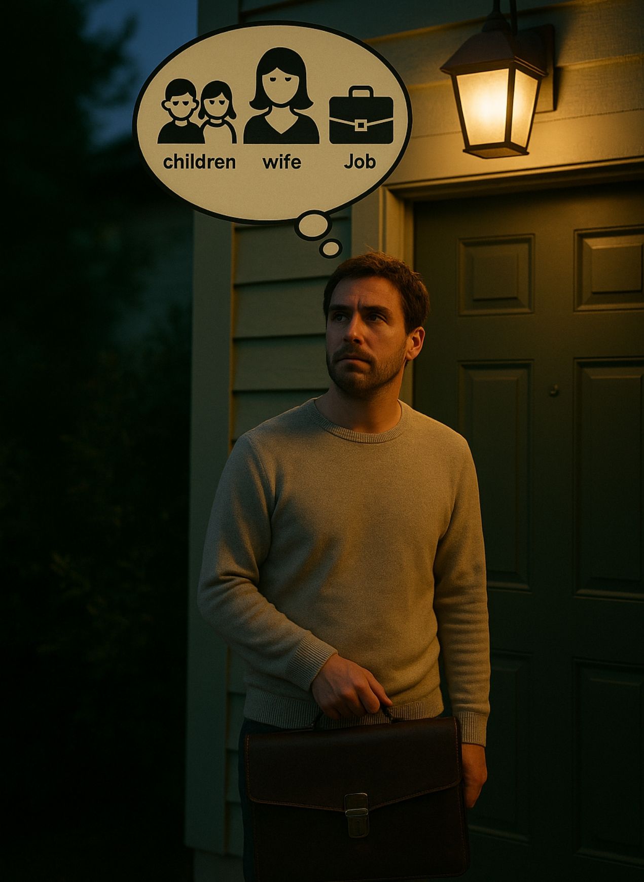 Eines Abends, nach einem besonders langen und schweren Arbeitstag, steht er vor seiner Haustür. Durch die Tür hört er seine Kinder lachen und gleichzeitig spürt er, wie ein schweres Gefühl seine Brust umfasst. Eins, dass er kaum benennen kann. Er setzt sich auf die Stufe vor der Tür. Nichts tun. Keine Verantwortung. Kein Müssen. Nur ein Atemzug. Und noch einer. Zum ersten Mal seit Wochen lässt er Stille zu.